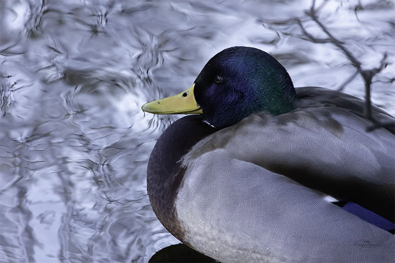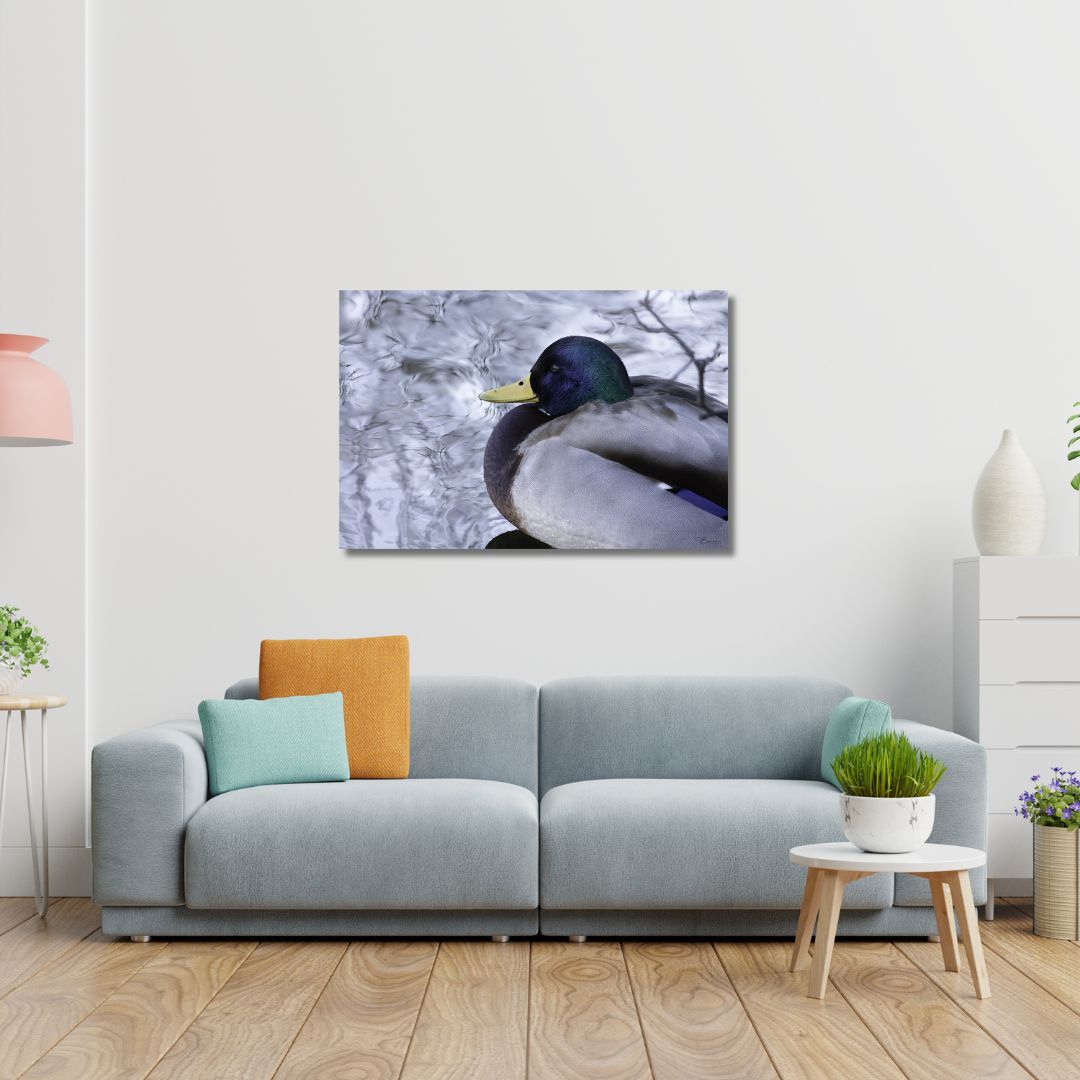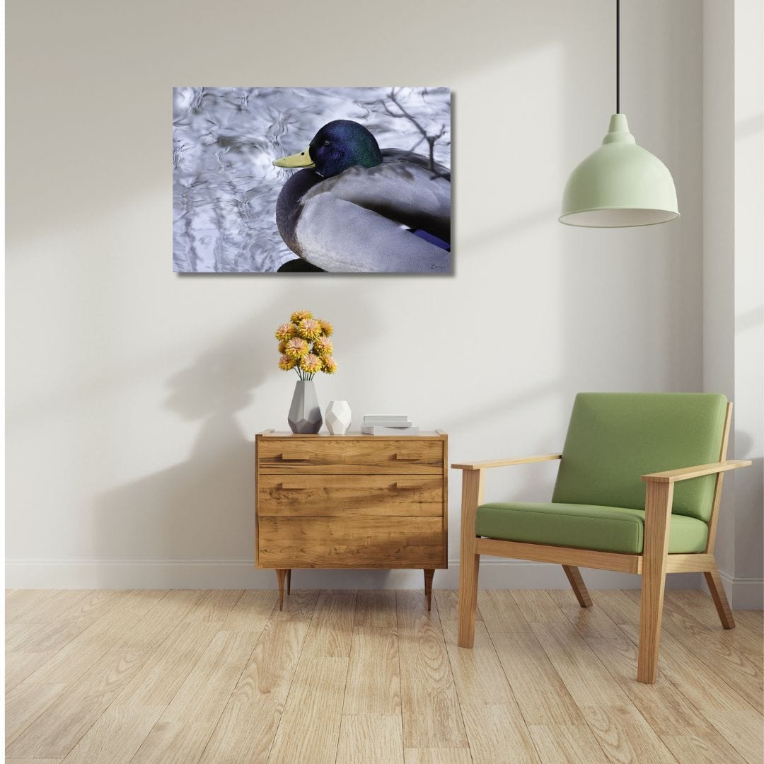 The photograph, “Colorful Mallard on Water I,” can be ordered as a high-quality Birch Wood Print, UV-printed directly onto sustainable birch veneer.