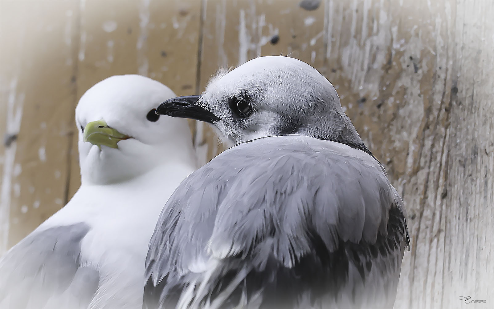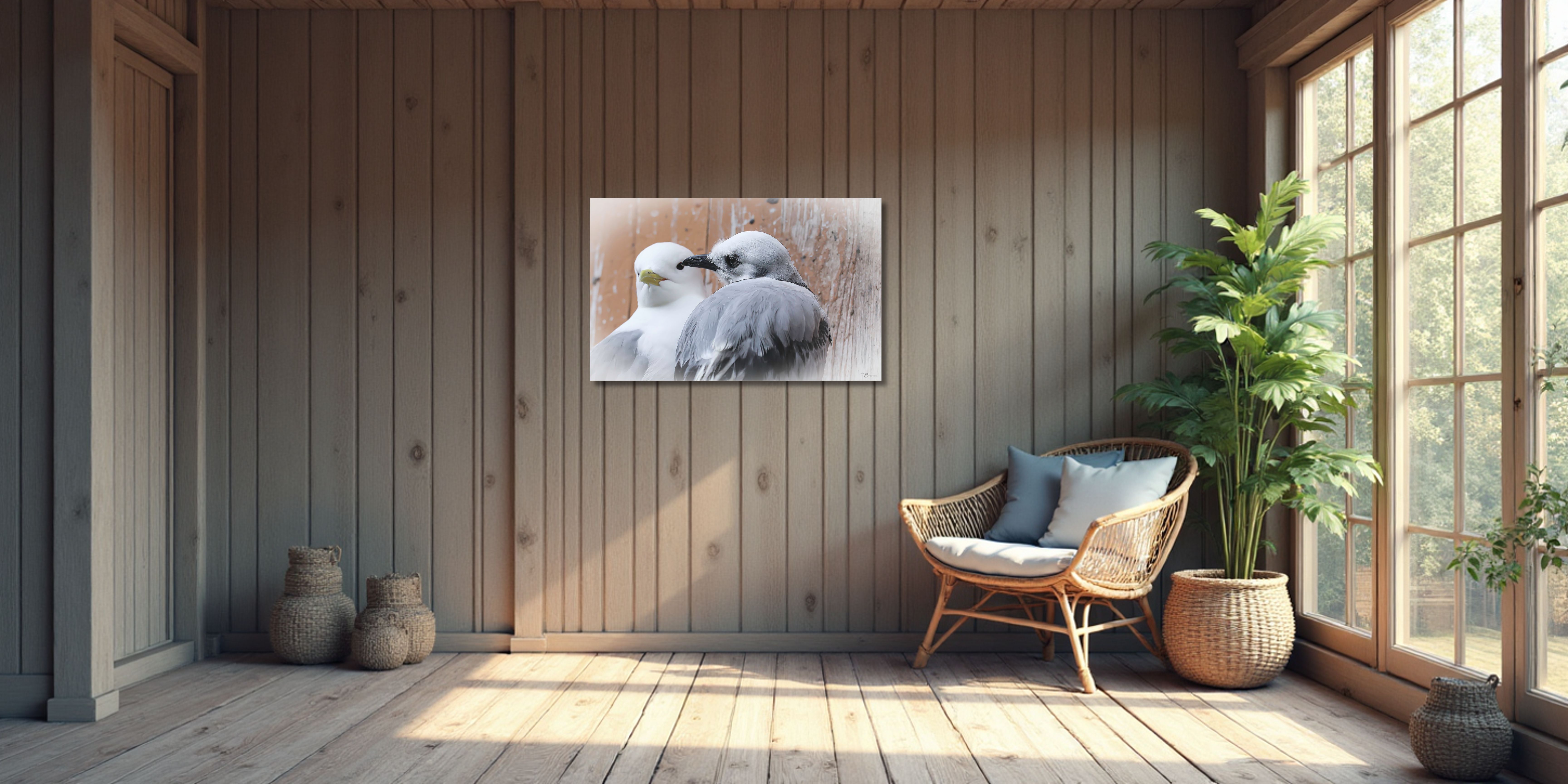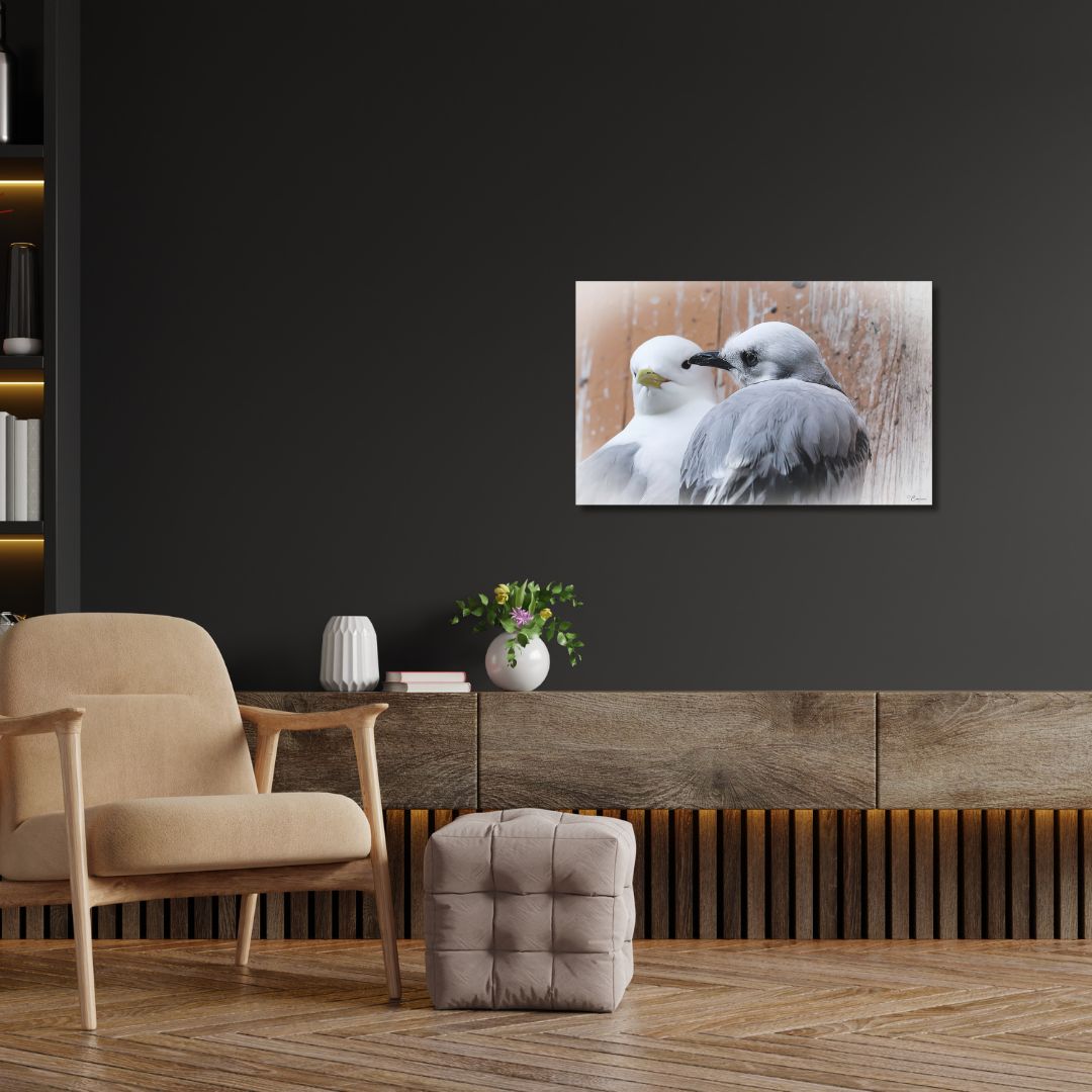 In the charming fishing village of Ã… in Lofoten, a young kittiwake rests safely in its nest on the old boathouse wall. Nearby, the mother stays close, watchful, and protective. Together with her young, she ensures safety and comfort. This limited edition fine art photograph captures an intimate moment between wildlife and the coastal heritage of Northern Norway.